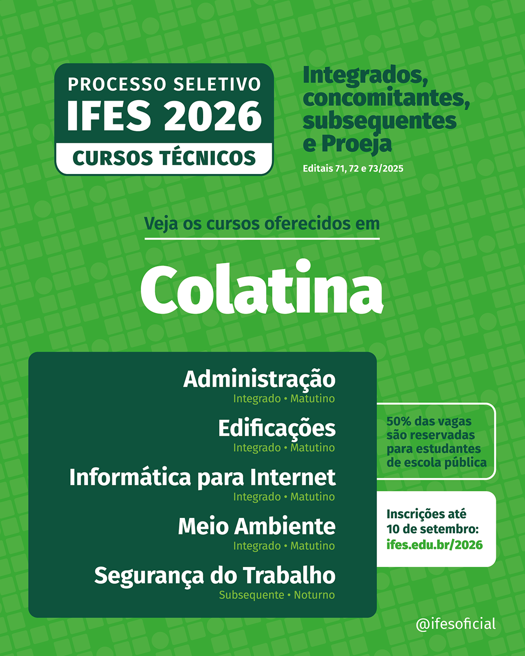 Início das aulas em 2026. Leia mais:Ifes oferta vagas em cursos superiores com seleção por prova de redação